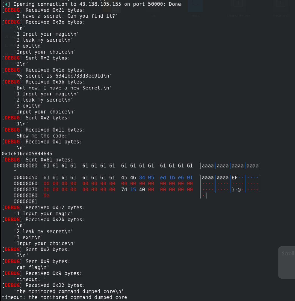 sub_4013C7接下来打印菜单内容,并根据用户输入的不同选项进入不同的代码块,输入2会打印当前生成的随机数数据,并在打印secret后重新生成;输入3会退出while循环,进入随机数secret校验部分;输入1会进入用户输入数据代码部分,这里存在栈溢出漏洞,用户输入的数据可以超过实际分配的栈内存大小,可以覆盖当前函数返回地址,在函数返回时控制函数返回地址执行任意代码。